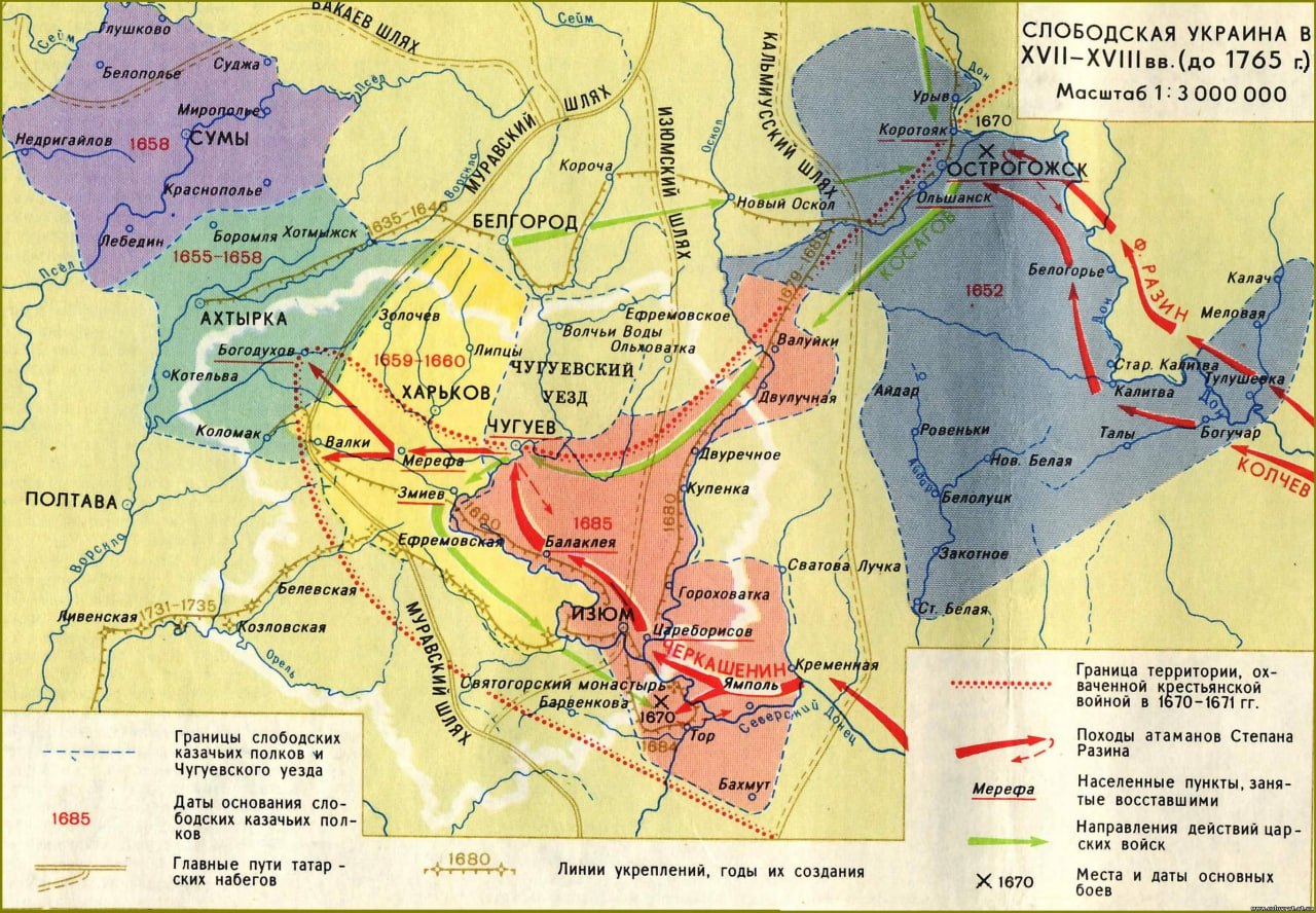 — Слобожанщина окончательно формируется в середине XVII века, где-то в 1650-е годы. К этому времени появились пять основных слободских полков: Острогожский, Харьковский, Ахтырский, Изюмский и Сумской. Центр был в Белгороде, оттуда и шли деньги. Города Острогожск и Ахтырка названы по одноимённым рекам, здесь осваивались переселенцы из Черниговской губернии. А вот Сумы — спорное название. Оно могло пойти от охотничьих сумок, но можно найти и татарский след — «су» с татарского переводится как «вода». Тоже самое и с Суджей. Ахтырка в переводе означает «белый яр».