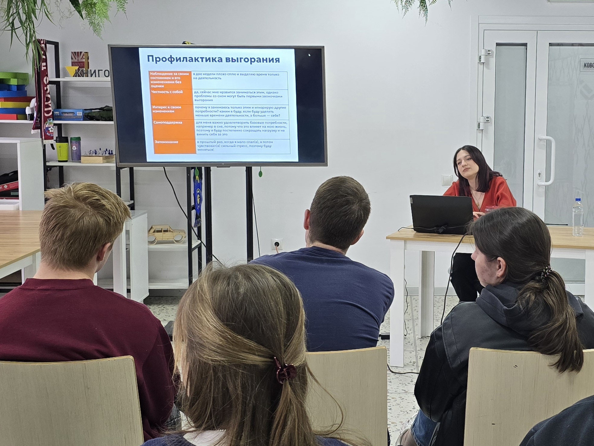 Советы участников лекции ориентированы скорее на студентов, которые занимаются волонтёрством, как хобби: «распределяй время, отдыхай, отказывайся от задач, если нет ресурса». Мне показалось, что подобные рекомендации всё-таки подойдут для не самых серьёзных ситуаций. И всё равно — хорошо, когда есть место, где можно обсудить свои проблемы и поделиться опытом преодоления трудностей.