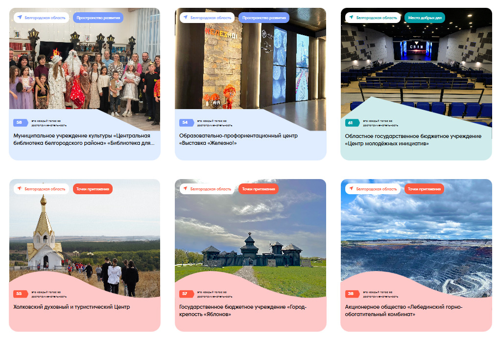 Чтобы поддержать Белгородскую область, необходимо зайти на сайт местагордости.рф, используя учетную запись ВКонтакте. Затем нужно выбрать нашу область и отдать голос за семь достопримечательностей в трех номинациях: