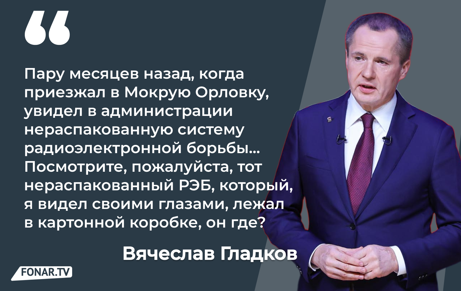 — Пару месяцев назад, когда приезжал в Мокрую Орловку, увидел в администрации нерасчехлённую, нераспакованную систему радиоэлектронной борьбы, хотя количество обстрелов со стороны Вооружённых сил Украины, атак через FPV-дроны было крайне высокое, и меня это, мягко скажем, возмутило и удивило. Посмотрите, пожалуйста, тот нераспакованный РЭБ, который, я видел своими глазами, лежал в картонной коробке, он где? — задал вопрос подчинённым Вячеслав Гладков.