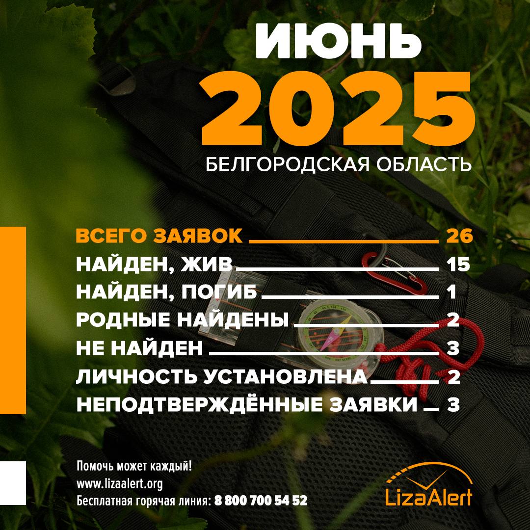 За июнь 2025 года поисково-спасательному отряду «ЛизаАлерт» поступило 26 заявок на поиск пропавших людей. Из них 15 человек найдены живыми, один — найден, погиб, два — найдены родные, три — не найдено, два — установлена личность. Три заявки на поиски оказались неподтверждёнными.