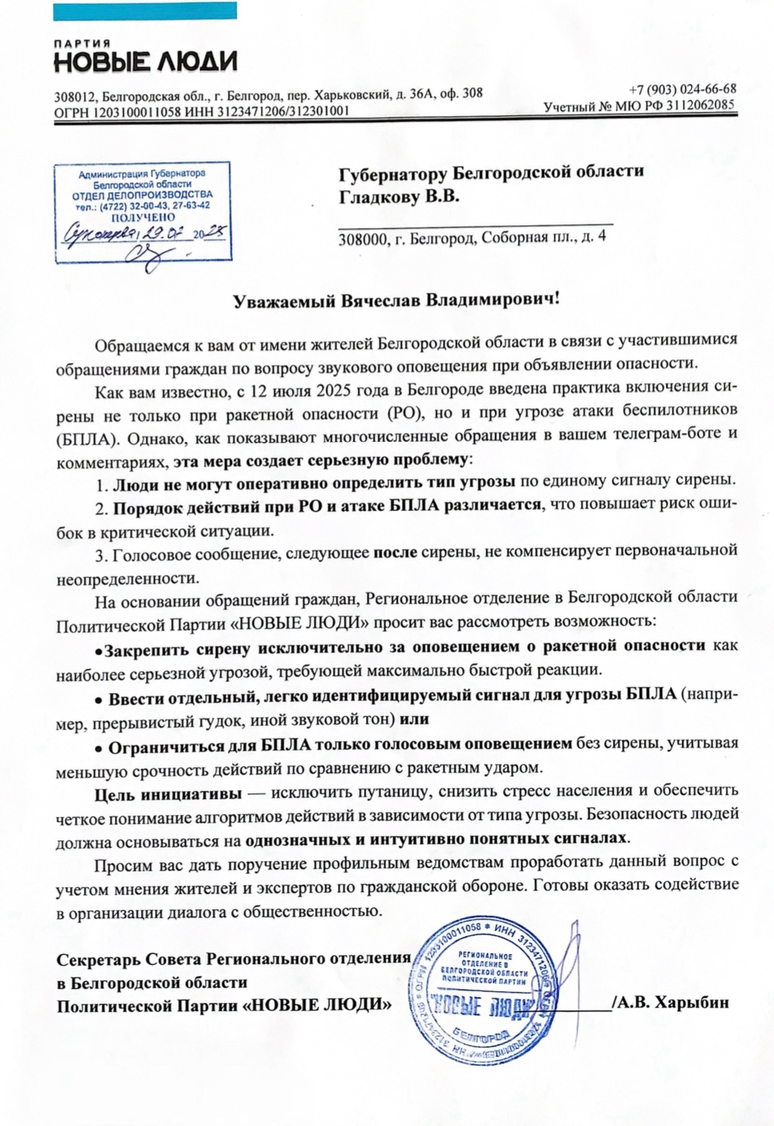 Региональное отделение партии «Новые Люди» направило официальное письмо губернатору Белгородской области с предложением пересмотреть систему оповещения о ракетной опасности и угрозах беспилотников.