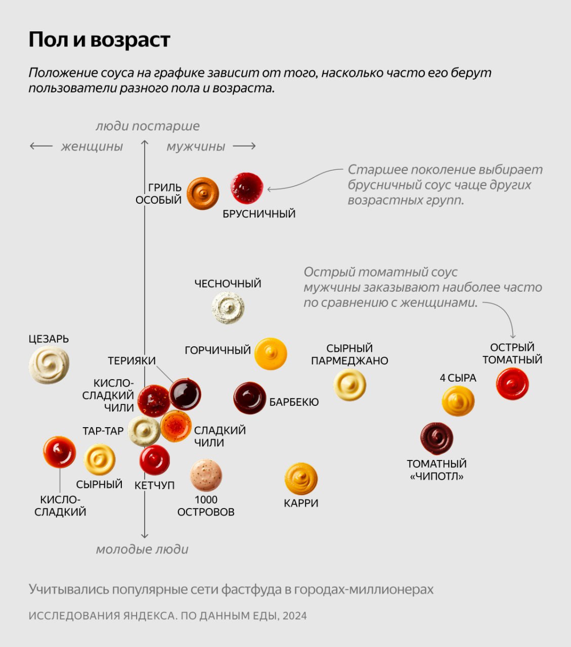 Мужчины чаще всего выбирают острый томатный соус и соус «4 сыра», а вот женщины отдают предпочтение более мягкому на вкус соусу «Цезарь». Что касается молодёжи, здесь, скорее всего, закажут соус «1000 островов» или карри, а и люди постарше — брусничный соус или гриль особый.