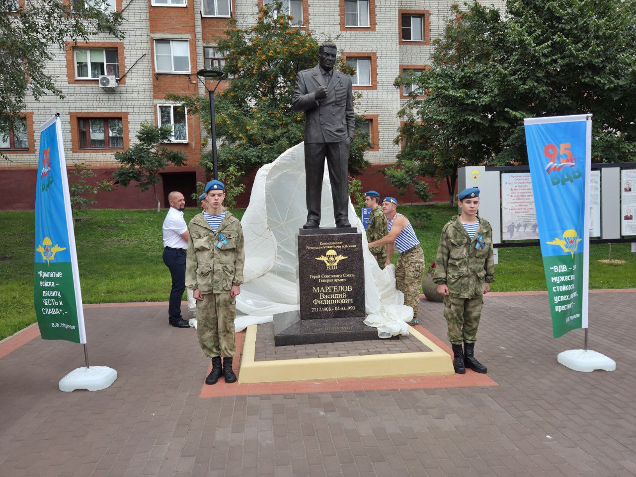 В сквере Десантников микрорайона Журавлики в Губкине в субботу, 2 августа, торжественно открыли памятник командующему Воздушно-десантными войсками, генералу армии Василию Маргелову. Монумент появился в преддверии 95-летия со дня образования ВДВ и стал, по словам местных властей, символом преемственности поколений «крылатой пехоты».