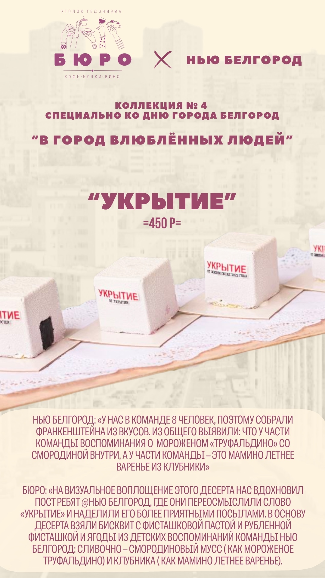 Неотъемлемую часть жизни белгородцев последних лет теперь можно попробовать на вкус: кофейня «Бюро» создала пирожное в виде укрытия. Лакомство вошло в коллекцию десертов, выпущенную ко Дню освобождения Белгорода.