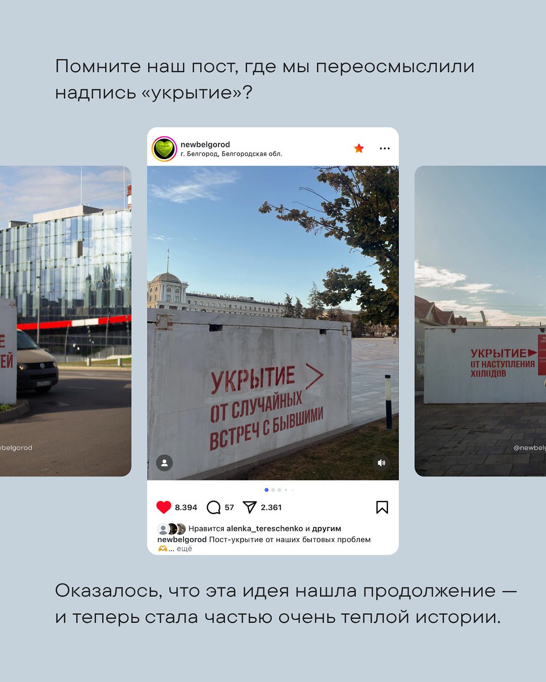 Воссоздать модульное укрытие в съедобном виде создателей десерта вдохновили авторы Инстаграм*-аккаунта «НьюБелгород», которые ранее придумали, как переосмыслить надпись «Укрытие».