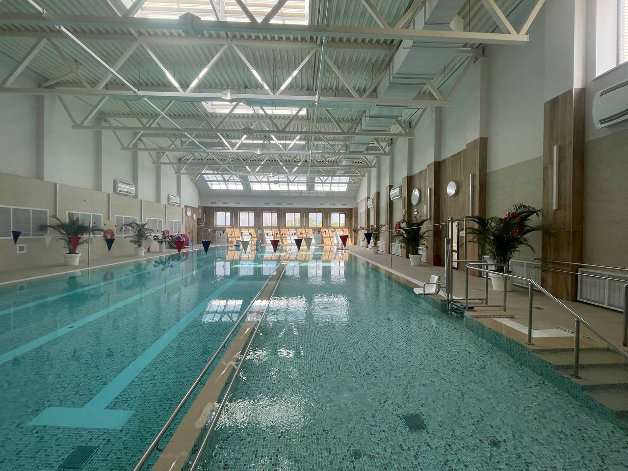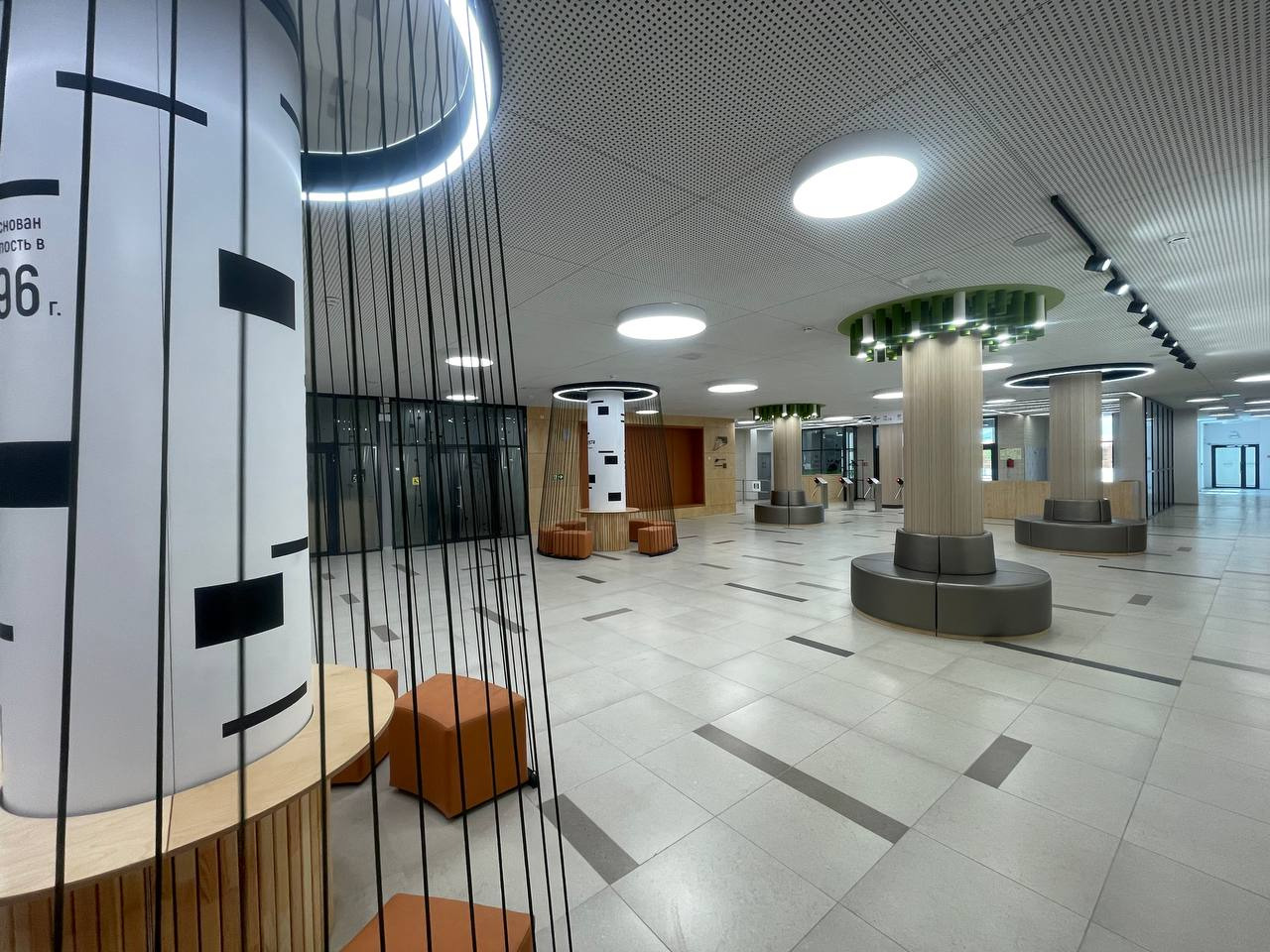 Спортивная инфраструктура включает бассейн с двумя чашами, несколько специализированных залов и универсальное пространство с раздвижными стенами. На территории созданы зелёные классы, теплицы, метеостанция и велопарковка на 300 мест.