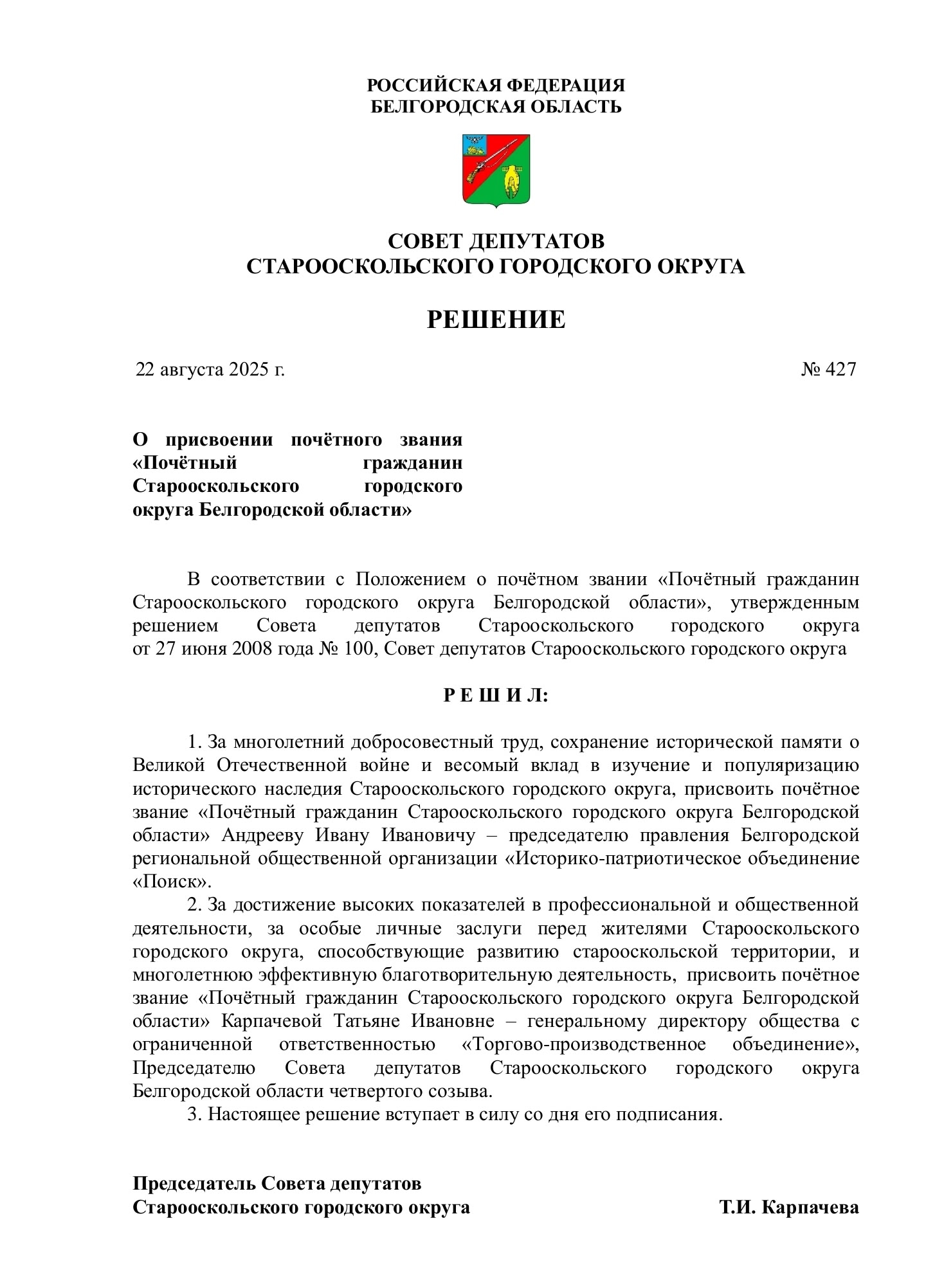 — За достижение высоких показателей в профессиональной и общественной деятельности, за особые личные заслуги перед жителями Старооскольского городского округа, способствующие развитию старооскольской территории, и многолетнюю эффективную благотворительную деятельность, присвоить почётное звание Карпачевой Татьяне Ивановне — генеральному директору ООО «Торгово-производственное объединение», Председателю Совета депутатов Старооскольского городского округа четвёртого созыва, — сказано в решении.