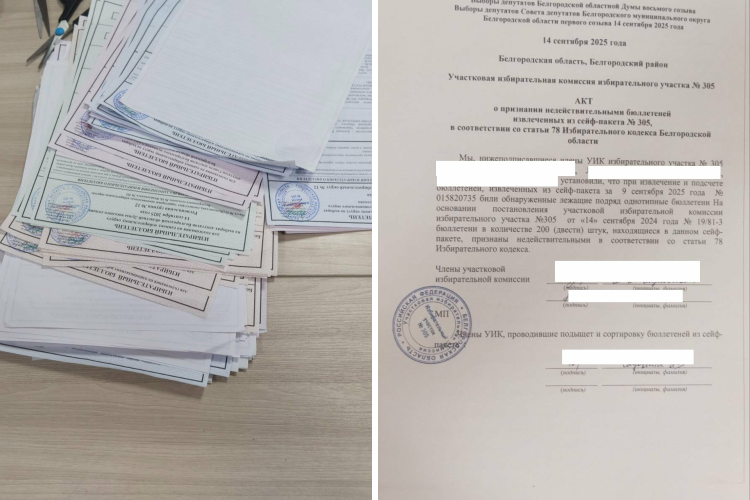 — При извлечении и подсчёте бюллетеней, извлечённых из сейф-пакета за 9 сентября, были обнаружены лежащие подряд однотипные бюллетени. На основании постановления УИК избирательного участка № 305 от 14 сентября 2025 года бюллетени в количестве 200 штук, находящиеся в данном сейф-пакете, признаны недействительными, — говорится в акте УИК, с которым ознакомилась редакция «Фонаря».