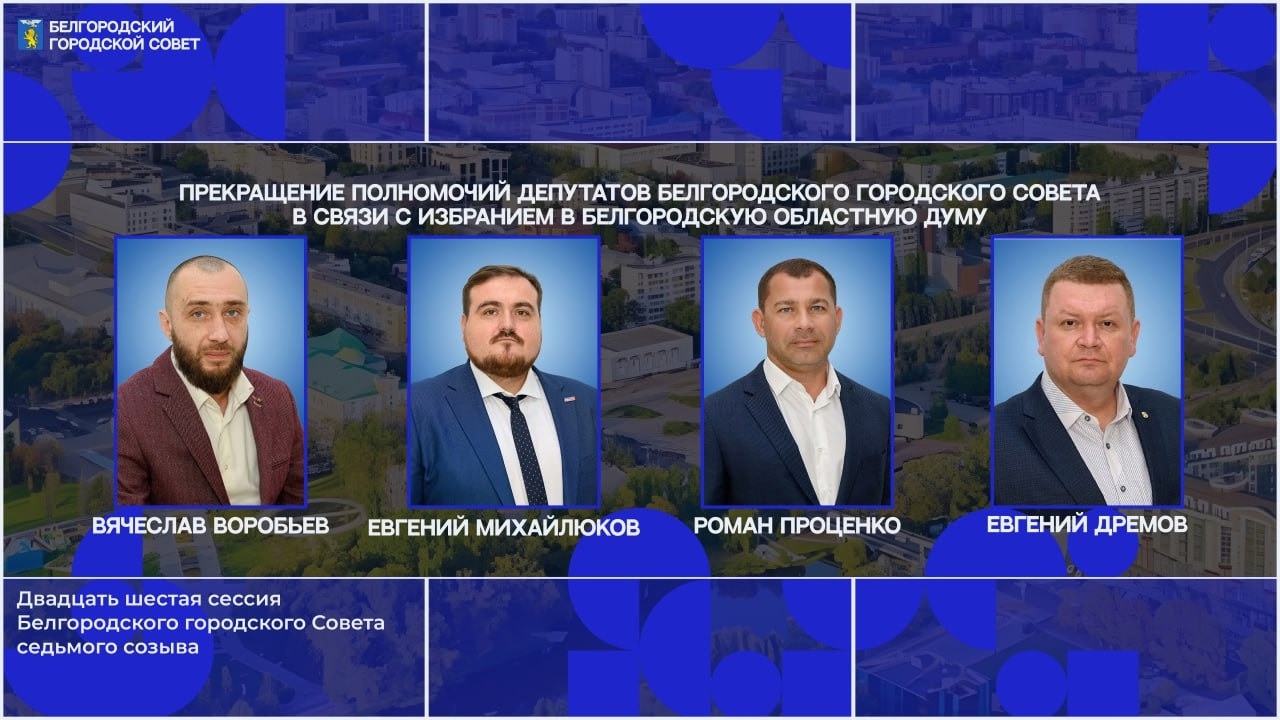 На очередной сессии Белгородского городского совета 23 сентября удовлетворены заявления четырёх депутатов о досрочном прекращении полномочий. Народные избранники сложили мандаты в связи с избранием в Белгородскую областную Думу восьмого созыва, выборы в которую прошли с 12 по 14 сентября.