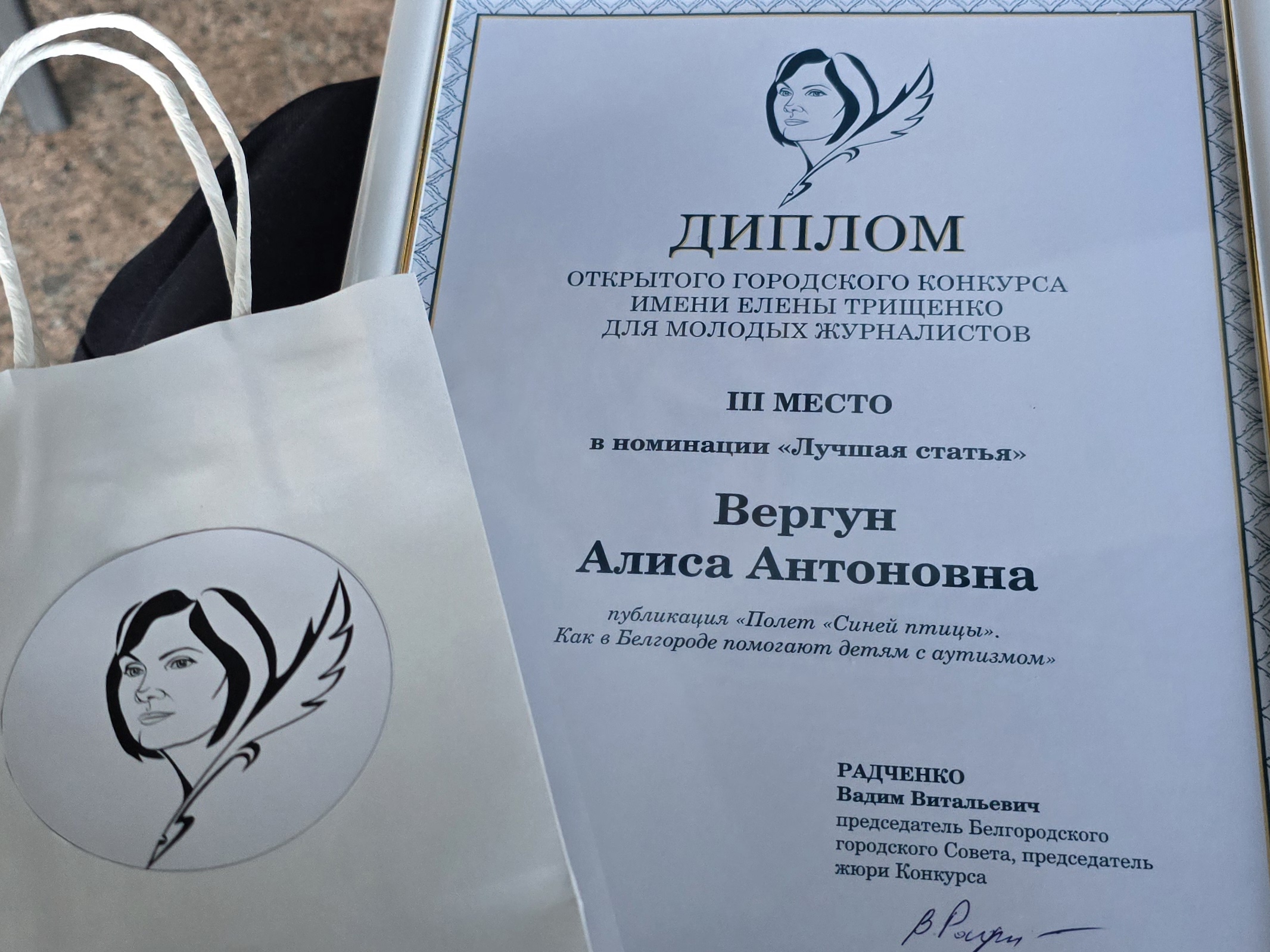 В Белгороде обнародовали итоги ежегодного областного конкурса для молодых журналистов имени Елены Трищенко. Конкурс проводят сотрудники холдинга «Белгород-медиа», где работала Елена Трищенко, и представители областного Союза журналистов, поддерживает их в этом Белгородский горсовет. Обозреватель «Фонаря» Алиса Вергун заняла третье место в номинации «Лучшая статья» за публикацию «Полёт „Синей птицы“».