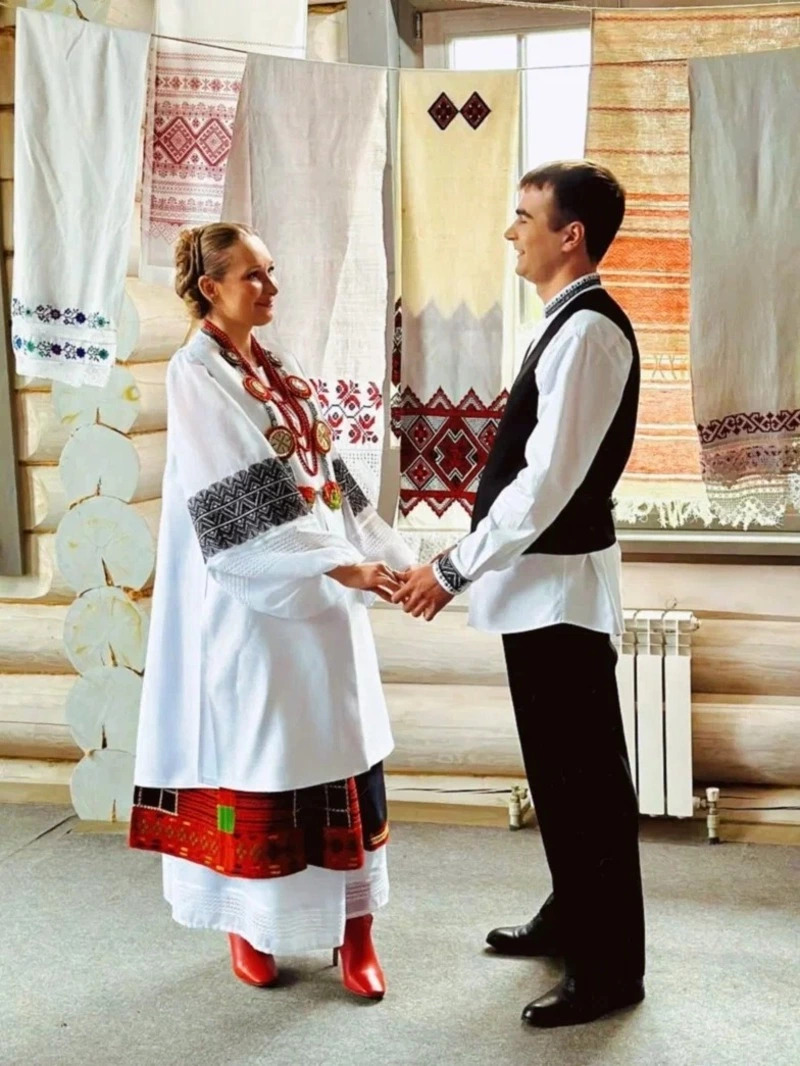 Жених и невеста сыграли свадьбу по старинным обычаям: с песнями, танцами и в народных костюмах. Главной деталью костюма невесты стала понёва её прабабушки.