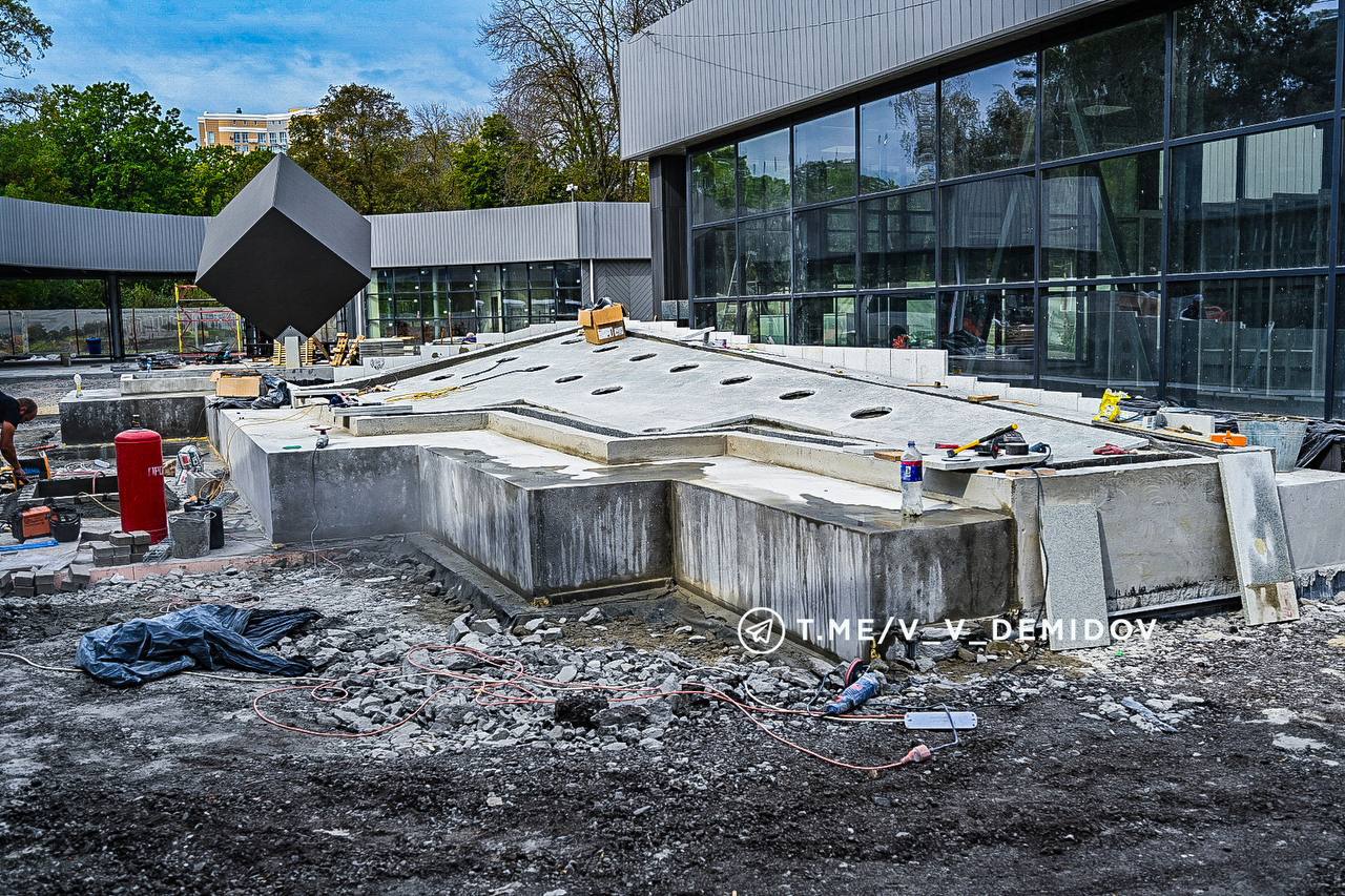 Уже завершено бетонирование стен и устройство плиты перекрытия технического помещения фонтана, смонтировано технологическое оборудование, которое будет управлять водным представлением. Кроме того, готовы основание и чаша будущего фонтана.