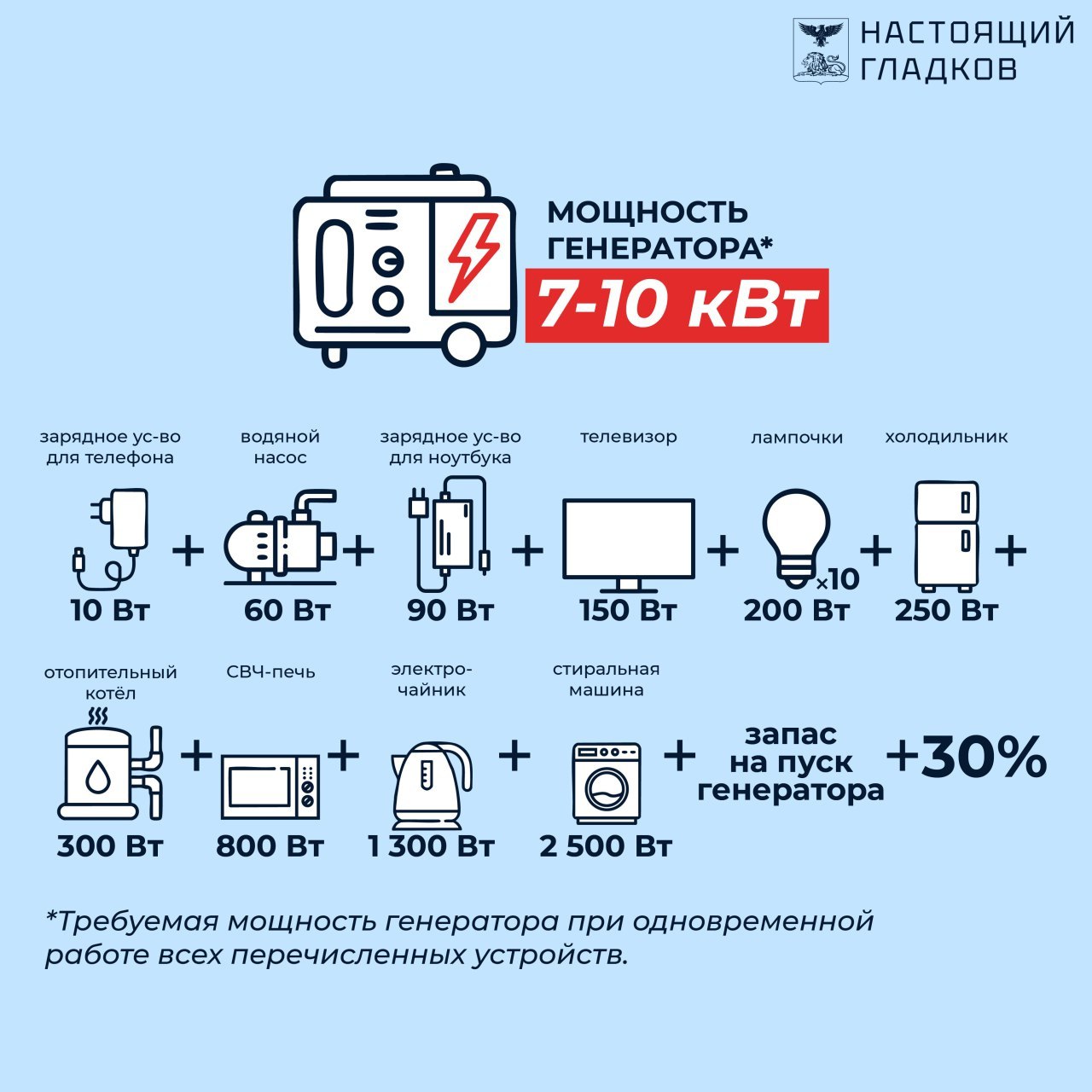 Губернатор Белгородской области Вячеслав Гладков в своём телеграм-канале опубликовал памятку, которая поможет белгородцам выбрать генератор, исходя из объёма потребляемой мощности и приборов, которые работают в доме. Всю информацию глава региона разместил на слайдах: