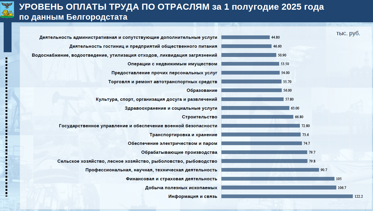 По словам омбудсмена, самая низкая средняя зарплата — 39 тысяч рублей на руки — зафиксирована в сфере административных услуг. Чуть выше доходы у работников водоснабжения и водоотведения — 44,3 тысячи рублей. Данные Белгородстата, однако, показывают другие цифры.