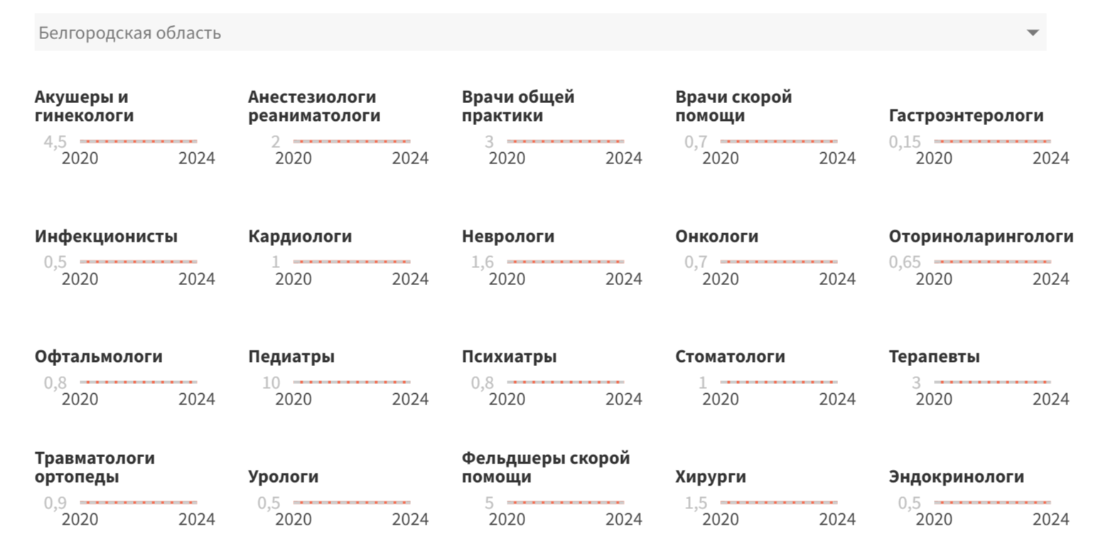 Эксперты отдельно оценили доступность первичной и специализированной медицинской помощи, поскольку эти уровни системы здравоохранения принципиально различаются, и объединение показателей могло бы исказить реальную картину. Количество врачей различных специализаций на 10 тысяч населения в Белгородской области следующее: