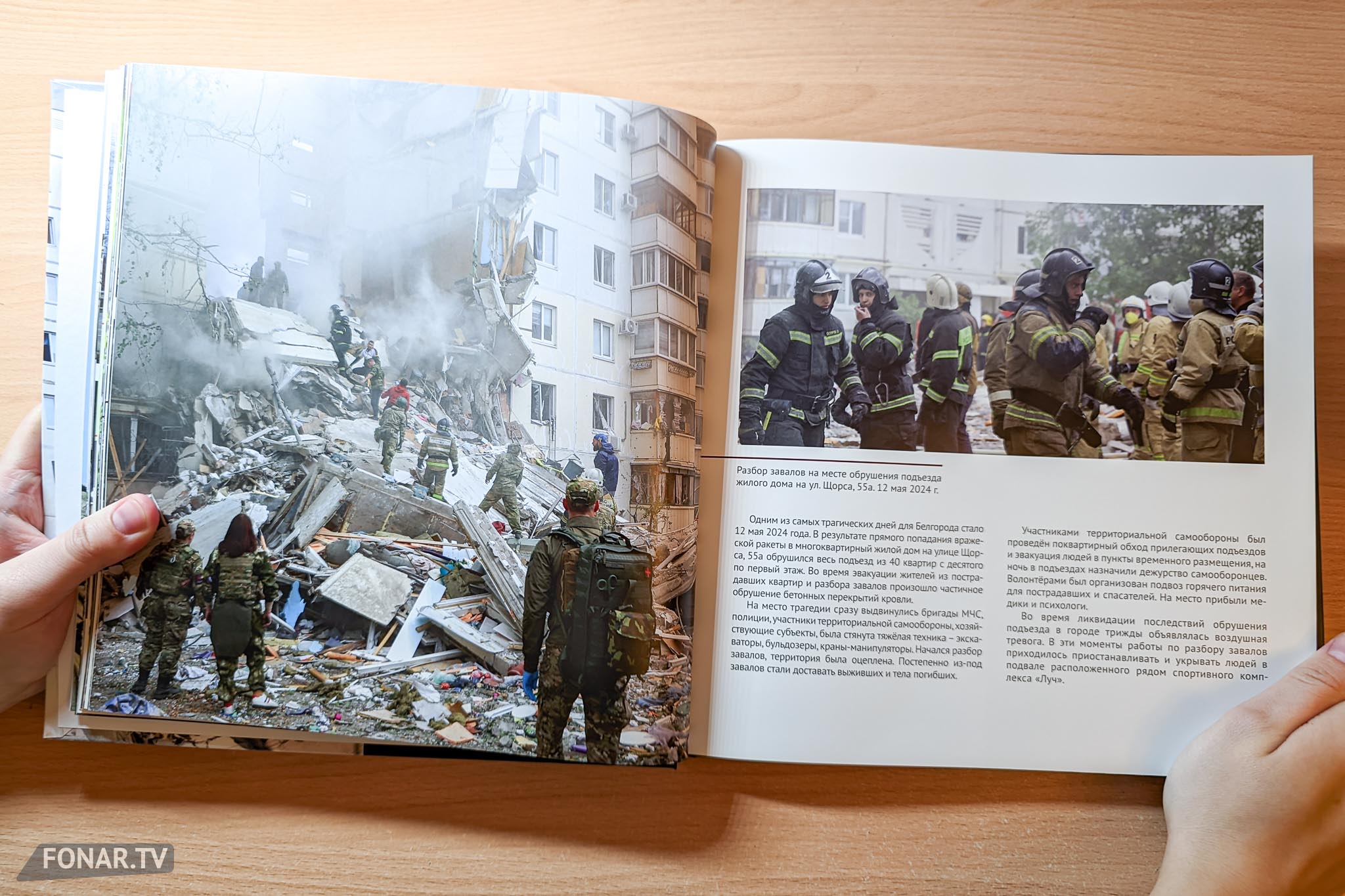 Структурно книга построена как большой фоторепортаж на бумаге. Главы содержат развороты с документальным подтверждением ударов по Белгороду, Грайворонскому и Шебекинскому округам: разрушенные школы, коммунальщики, ремонтирующие крыши под прилётами, выезды пожарных, эвакуация семей, ночные ремонты теплотрасс и электросетей. Одним из фоторепортёров, которые дали свои кадры для книги, стал фотограф «Фонаря» Антон Вергун, который не раз выезжал для съёмки последствий обстрелов, а также восстановления разрушенных зданий.
