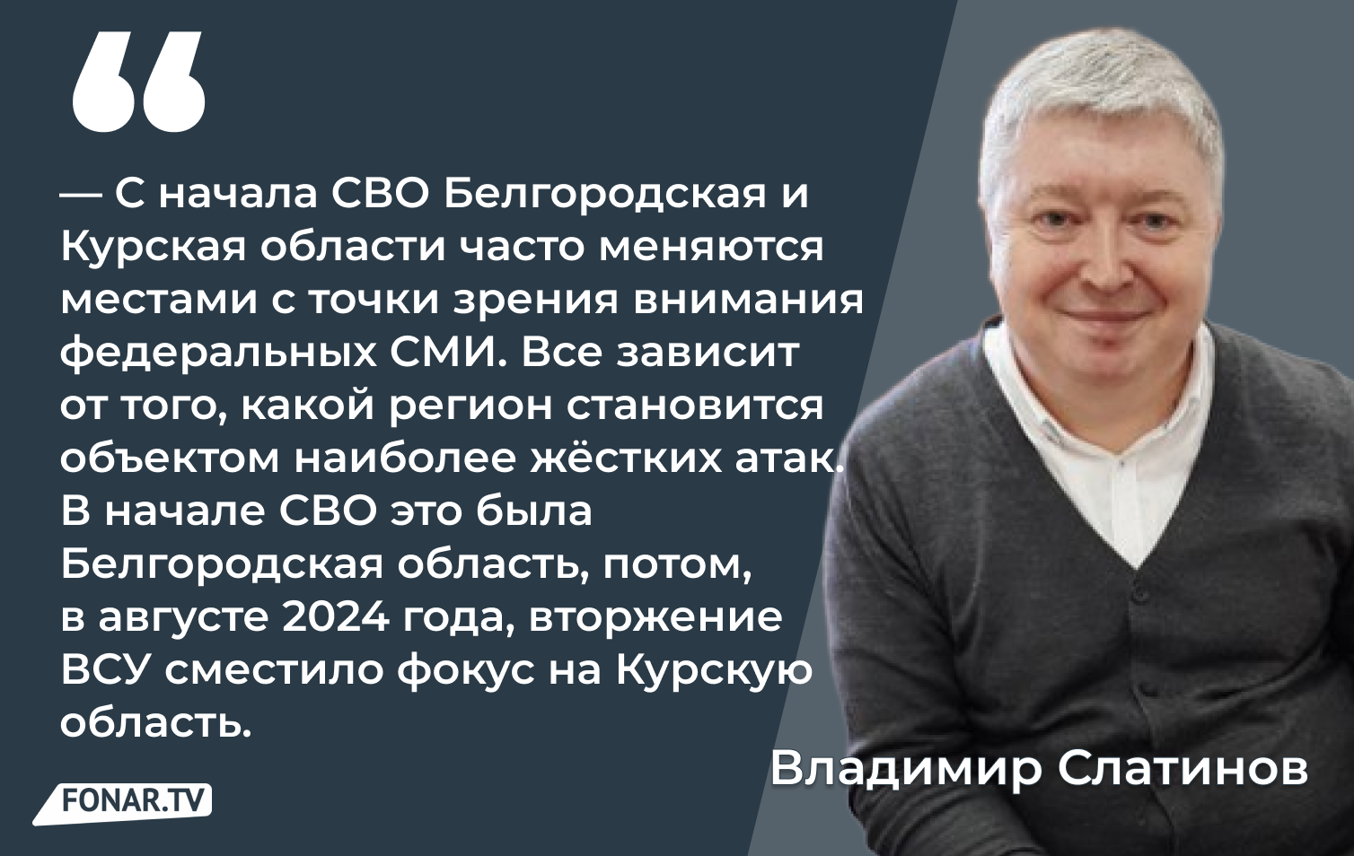 — С начала СВО Белгородская и Курская области часто меняются местами с точки зрения внимания федеральных СМИ. Всё зависит от того, какой регион становится объектом наиболее жёстких атак. В начале СВО это была Белгородская область, потом, в августе 2024 года, вторжение ВСУ сместило фокус на Курскую область, — рассказывает эксперт.