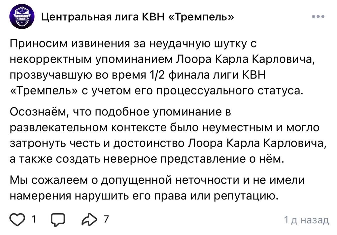 Позже организаторы лиги опубликовали официальные извинения. Они признали шутку некорректной и неуместной, сославшись на процессуальный статус бизнесмена. В заявлении отметили, что такая шутка могла затронуть честь и достоинство Лоора. На это обратил внимание телеграм-канал «ОК! Старый Оскол».