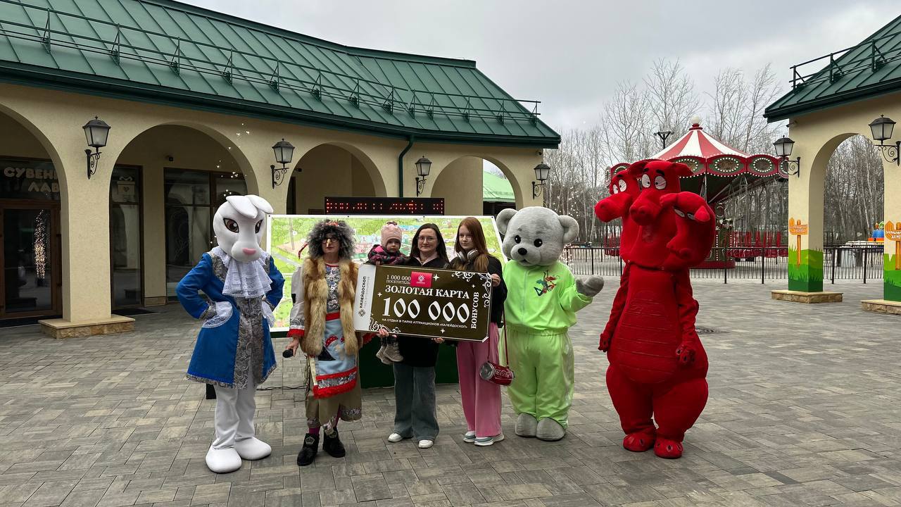Юбилейной посетительнице вручили золотой сертификат на сто тысяч бонусов. Эти баллы можно потратить на посещение аттракционов в парке.