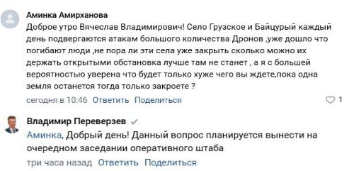 Глава администрации Борисовского района Владимир Переверзев остался недоволен работой сотрудника, ответственного за ведение его страницы в социальных сетях. Поводом стал некорректный ответ от его имени, который был размещён под вопросом в ВК губернатору Вячеславу Гладкову о критической ситуации в сёлах Грузское и Байцуры. Женщина предложила отселить людей и закрыть сёла.