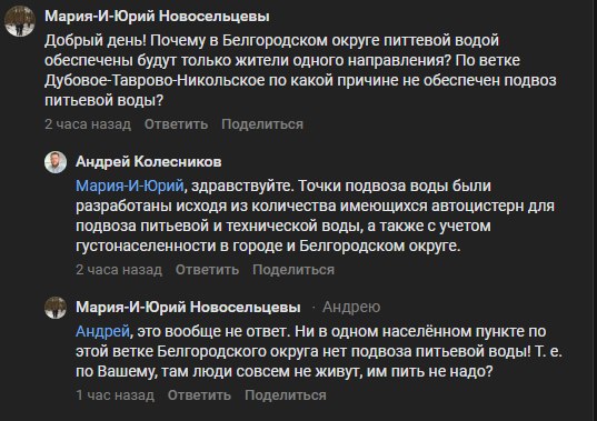 Директор «Белоблводоканала» Андрей Колесников прямо в комментариях ответил на претензии. Он пояснил, что точки подвоза технической и питьевой воды разработаны исходя из количества имеющихся автоцистерн и с учётом густоты населения в городе и Белгородском округе. На вопросы, почему в некоторых сёлах нет подвоза питьевой воды, он дал тот же ответ.