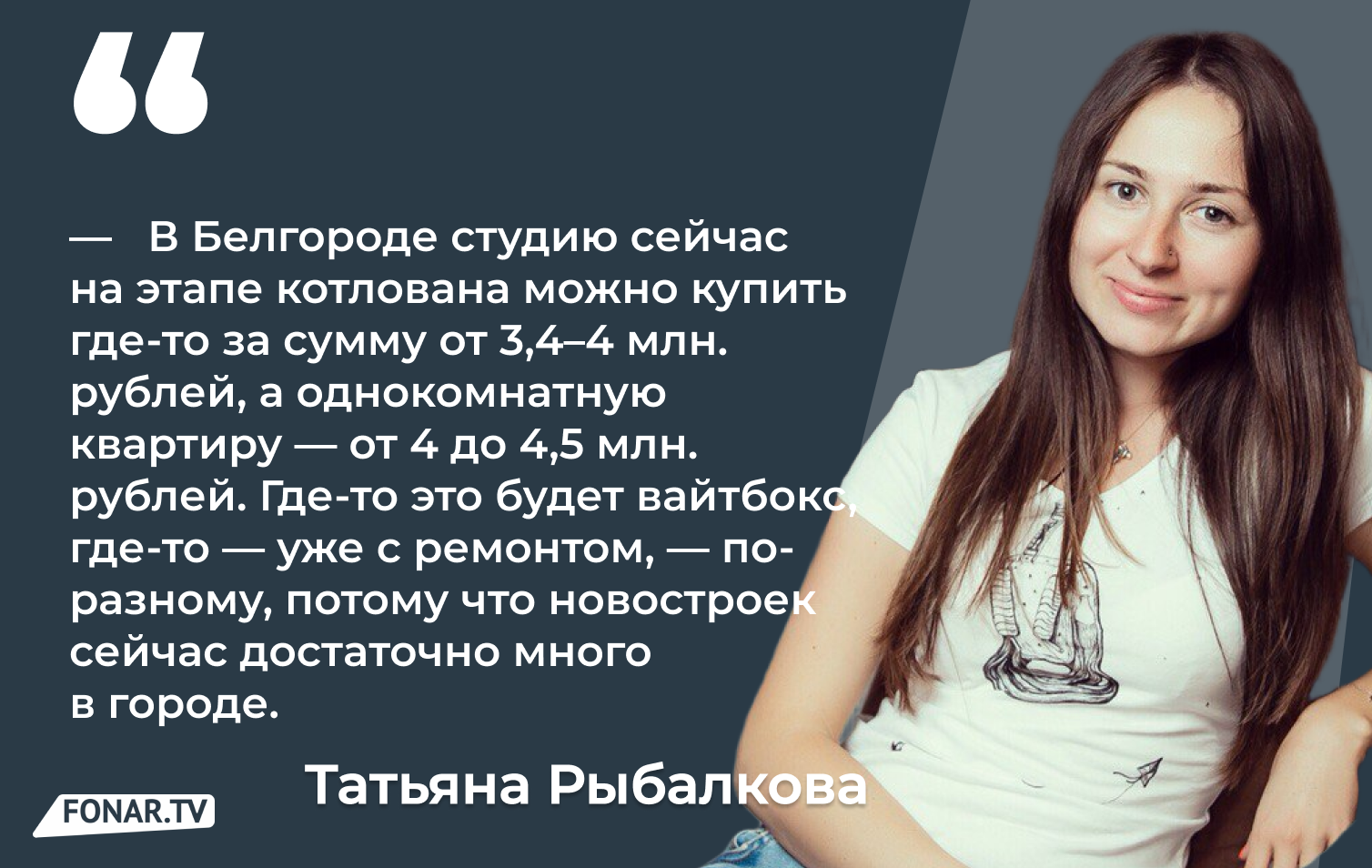 В Белгороде, если более точно говорить по статистике, студию сейчас на этапе котлована можно купить где-то за сумму от 3,4–4 миллионов рублей, а однокомнатную квартиру — примерно от 4 до 4,5 миллиона рублей. Где-то это будет вайтбокс, где-то — уже с ремонтом, — по-разному, потому что новостроек сейчас достаточно много в городе. Нужно смотреть по запросу, по территориально и какая будет привязка у человека.