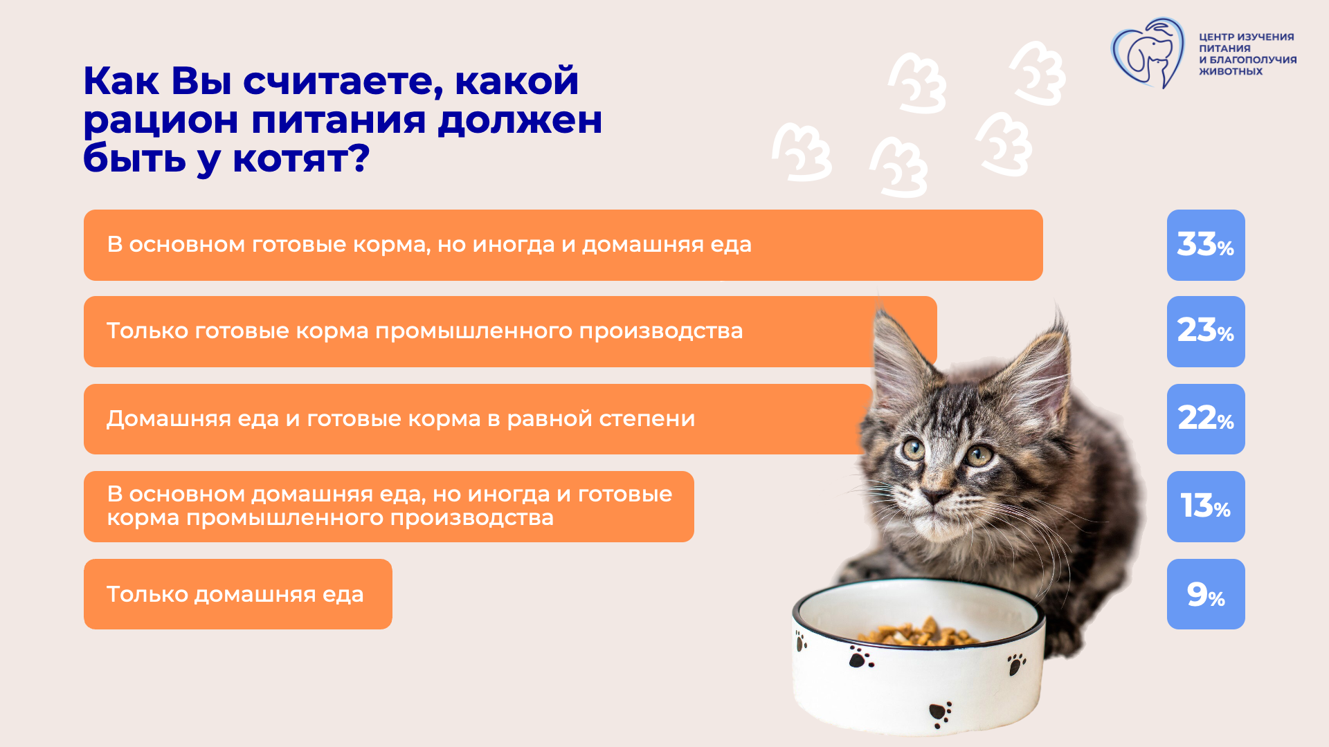 В первые месяцы 39 процентов хозяев переживают, правильно ли подобран рацион. При этом 91 процент считают, что лучше давать готовый корм, а 82 процента выбирают специальный корм для котят. По мнению участников опроса, главное его отличие — больше витаминов и минералов для иммунитета (64 процента), кальция для костей и зубов (59 процентов) и белка для мышц (58 процентов).