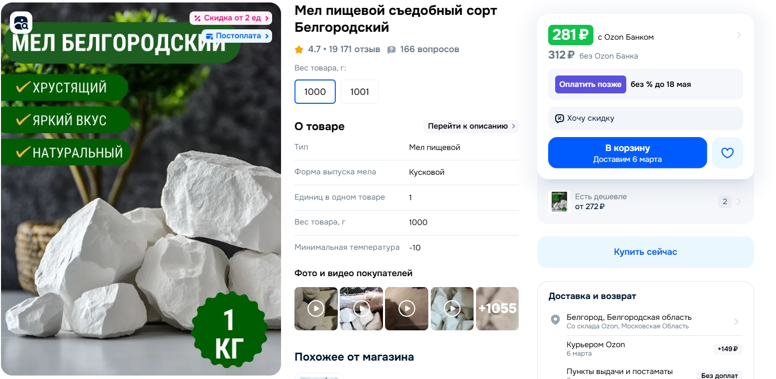 Белгородчина славится своими меловыми запасами, и теперь местный мел можно купить и на маркетплейсах — по 281 рублю за килограмм. В описании товара мел называют «натуральным, экологически чистым продуктом» с «ярким меловым вкусом и неповторимым хрустом». На необычное лакомство оставили отзывы более 19 тысяч покупателей, а рейтинг товара составляет 4,7.