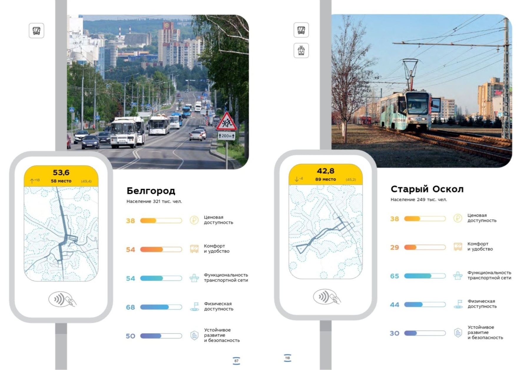 Старый Оскол оказался на 89-м месте с результатом 42,8 балла. Это на четыре позиции ниже, чем в прошлом году. Функциональность транспортной сети здесь оценили в 65 баллов — это лучший показатель города. А вот развитие и безопасность, комфорт и удобство набрали всего 30 и 29 баллов соответственно. Ценовая доступность в Старом Осколе такая же, как в Белгороде, — 38 баллов.