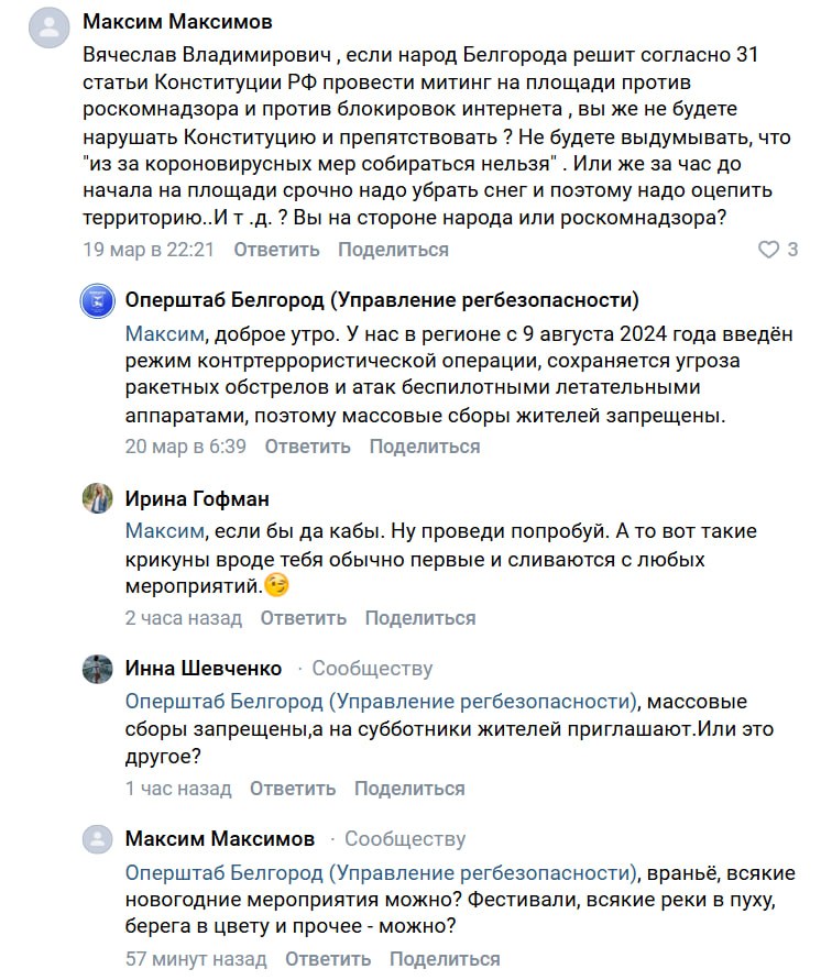 «Белгородский канал» обратил внимание на комментарий, который мужчина оставил на странице губернатора Вячеслава Гладкова во «ВКонтакте». Белгородец спросил, можно ли провести митинг против блокировок интернета.