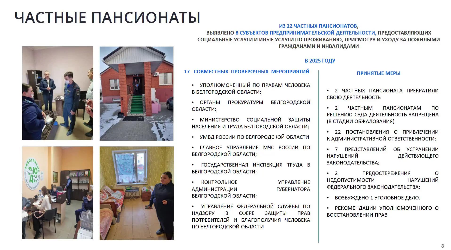 Ранее стало известно, что в Белгородской области перестали работать четыре частных учреждения для пожилых и людей с инвалидностью. Два пансионата закрыли по решению суда, ещё два — после вмешательства прокуратуры.