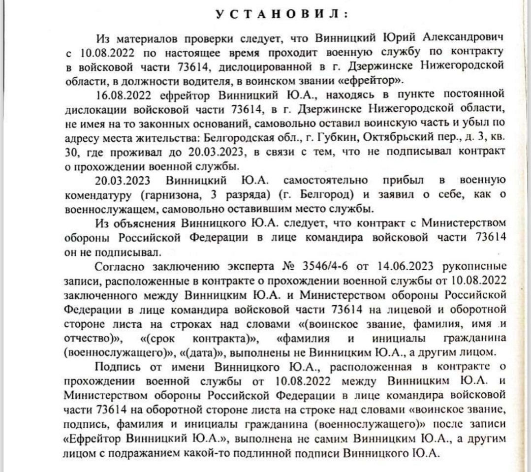Всё началось в 2023 году. В военкомате Губкина выяснилось, что на имя Юрия Винницкого якобы заключён контракт о прохождении военной службы ещё 10 августа 2022 года, то есть до частичной мобилизации. Мужчина явился в военкомат, дал объяснения, что контракт не подписывал. Его отправили в Белгород — в комендатуре Белгорода он снова всё объяснил, прошёл военно-врачебную комиссию и дал образцы для почерковедческой экспертизы. Она подтвердила, что подпись в документах выполнена другим лицом с подражанием подписи Винницкого.