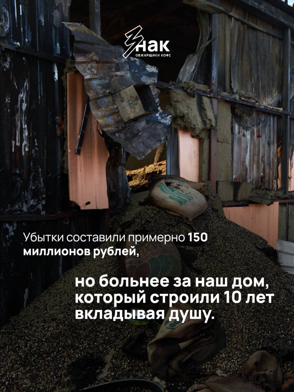 Утром 5 апреля в Пушкарном произошёл пожар: сгорел обжарочный цех и склад зелёного кофейного зерна компании «Знак». Убытки оценивают примерно в 150 миллионов рублей, сообщили представители бизнеса в своём телеграм-канале.