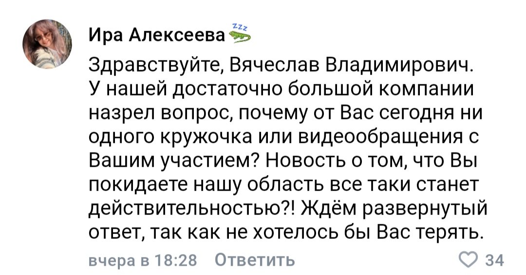 — Почему от Вас сегодня ни одного кружочка или видеообращения с Вашим участием? Новость о том, что Вы покидаете нашу область, всё-таки станет действительностью? — беспокоится одна из белгородок в комментариях на странице Гладкова во «ВКонтакте».
