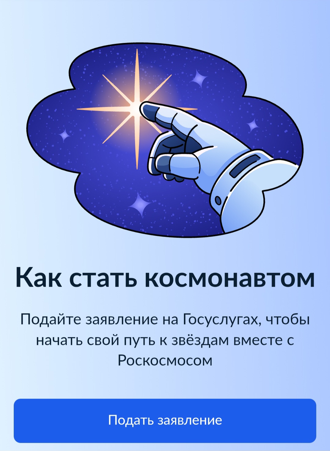 На портале «Госуслуги» начался приём заявок на участие в пятом открытом отборе в отряд космонавтов. Подать заявку можно до 30 июня 2026 года.