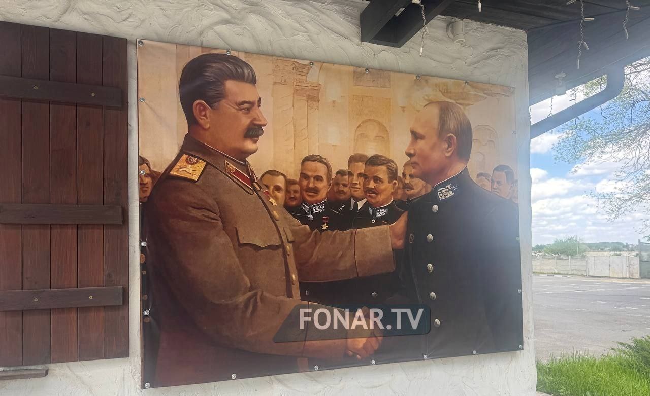 На фасаде белгородского кафе появилась картина, на которой Сталин приветствует Владимира Путина.