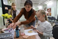 Фотогалерея имени Виталия Собровина в этот раз стала одной из самых тёплых точек маршрута: здесь к 17:00 звучали стихи и музыка — студия «МолокО» открыла вечер своей «Осенней рапсодией». Спустя час — рядом с фотографиями Николая Малых — обсуждали деревянную Русь, её фактуру и ощущение времени. За столами творческой лаборатории — роспись стекла, дерево, декупаж, запах лака, краски на руках взрослых и детей.