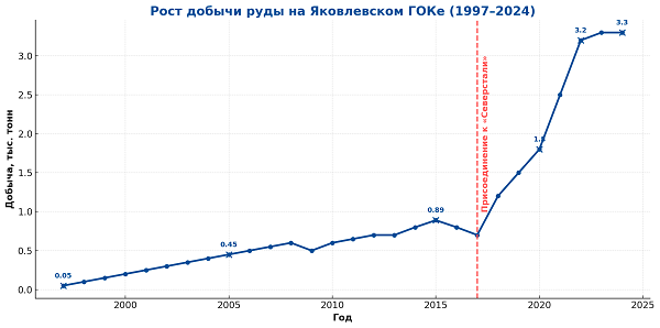 Как менялась добыча железной руды на Яковлевском ГОКе с 1997 по 2024 годы